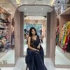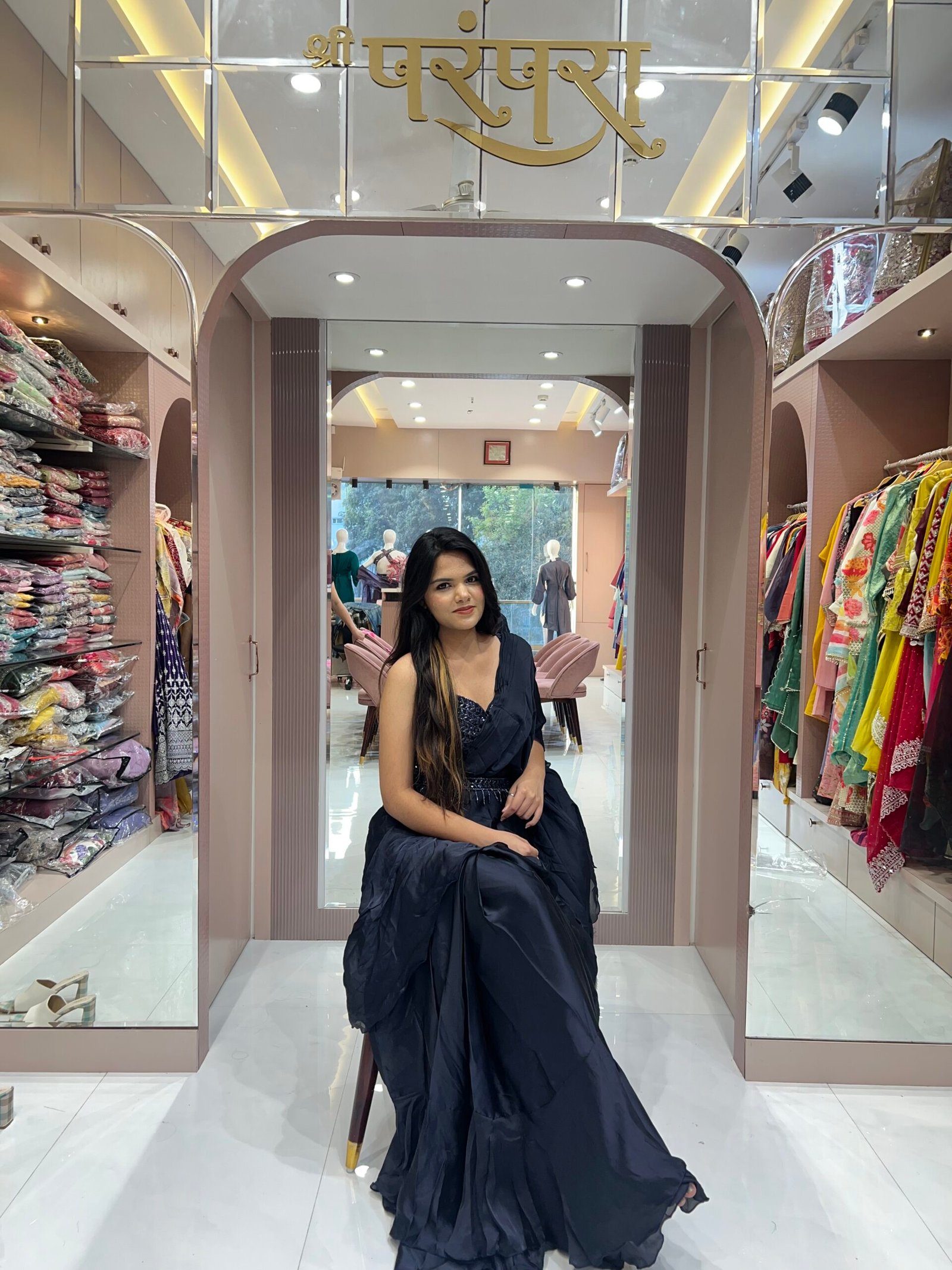 The Navy Blue Frill Embellished Saree is crafted in lightweight georgette chunari fabric, offering a soft and graceful drape. Designed with elegant frill detailing, it comes with a stitched handwork blouse and a stylish belt for a modern touch. Perfect for parties, receptions, and special occasions, it blends sophistication with contemporary charm. Available at Best clothing shop in Indore for Women.
